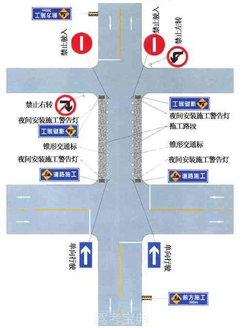 市区道路交叉口,有一侧路面施工时的设施布设例